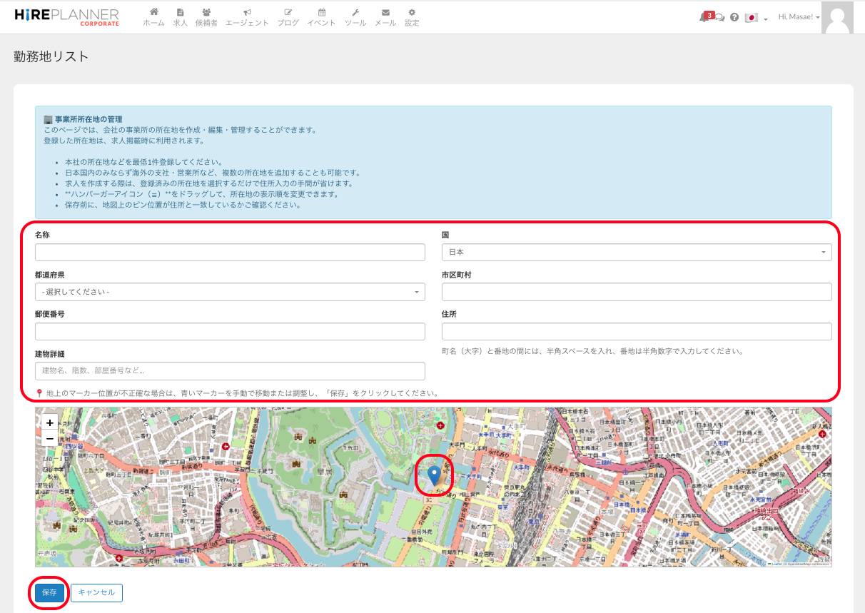 事前に勤務地情報を設定しておけば、求人票作成時に毎回入力する必要はありません。